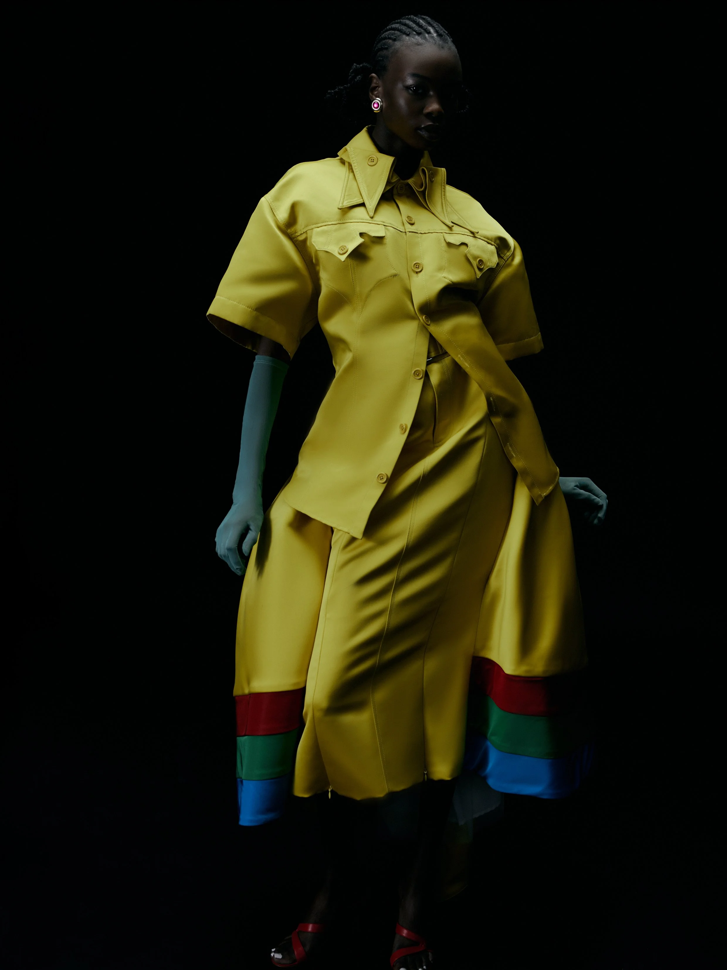 ON MAMMINA: JACKET & SKIRT Rachel Comey, EARRINGS & BELT Rainbow Unicorn Birthday Surprise
